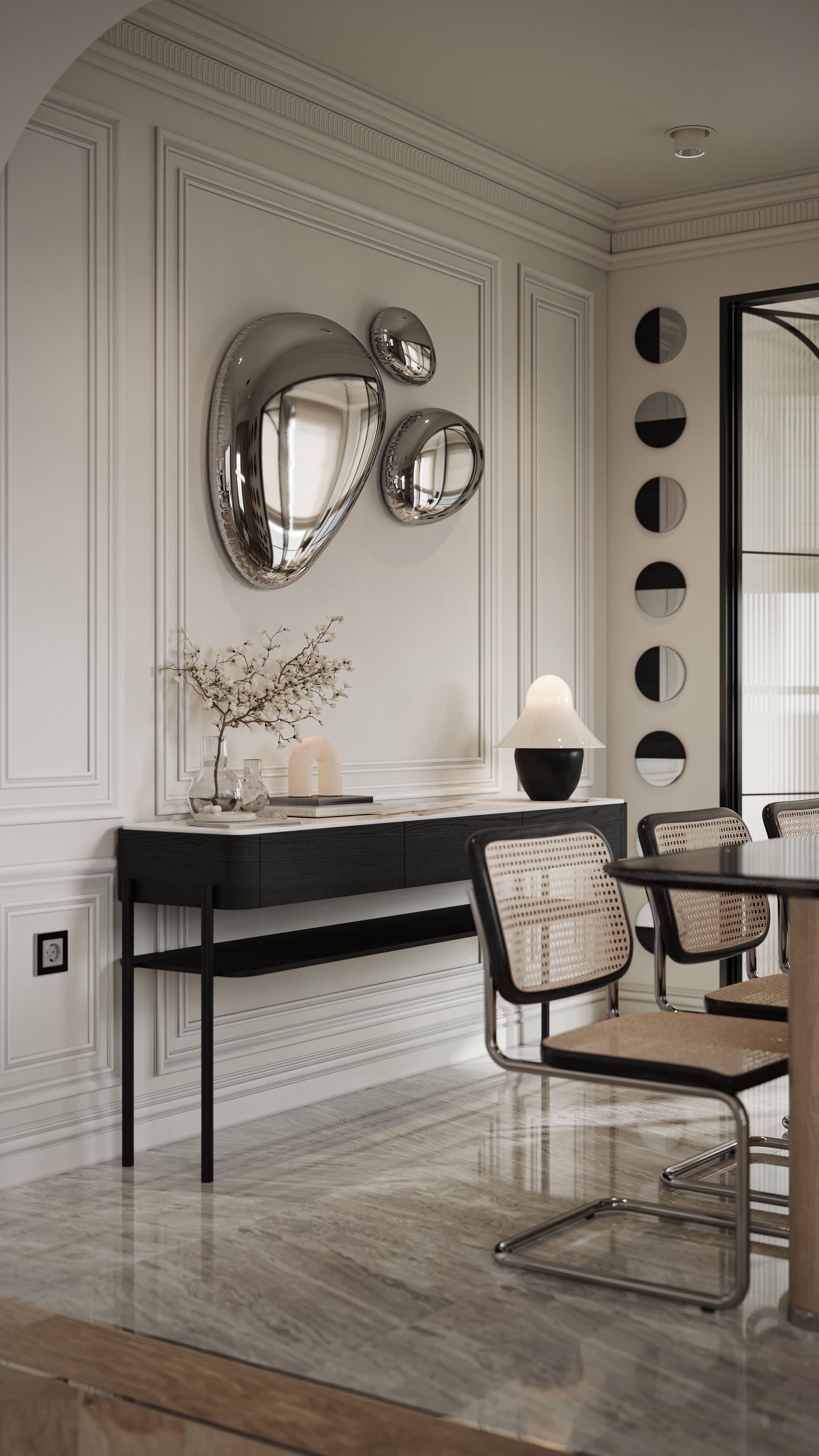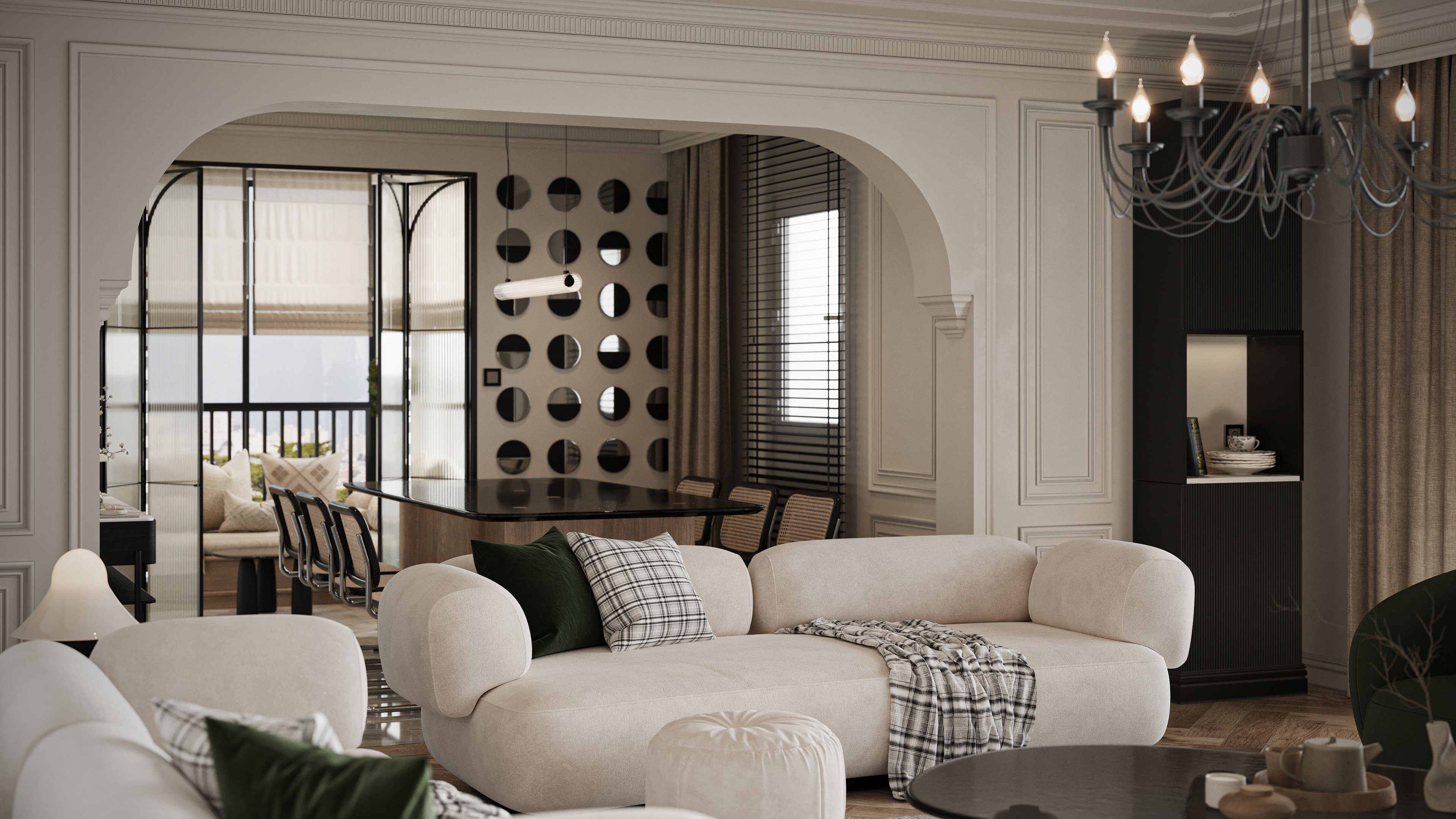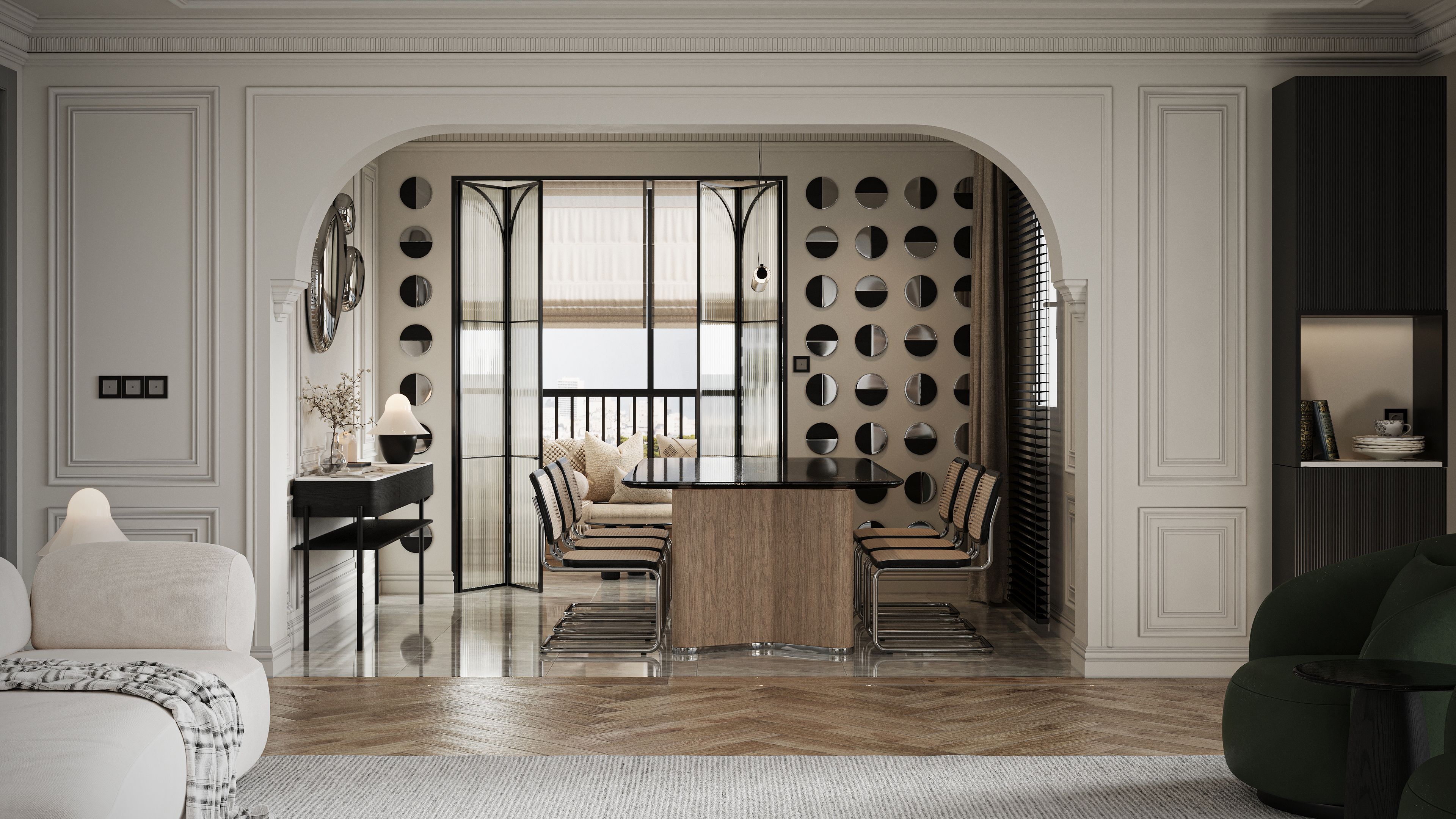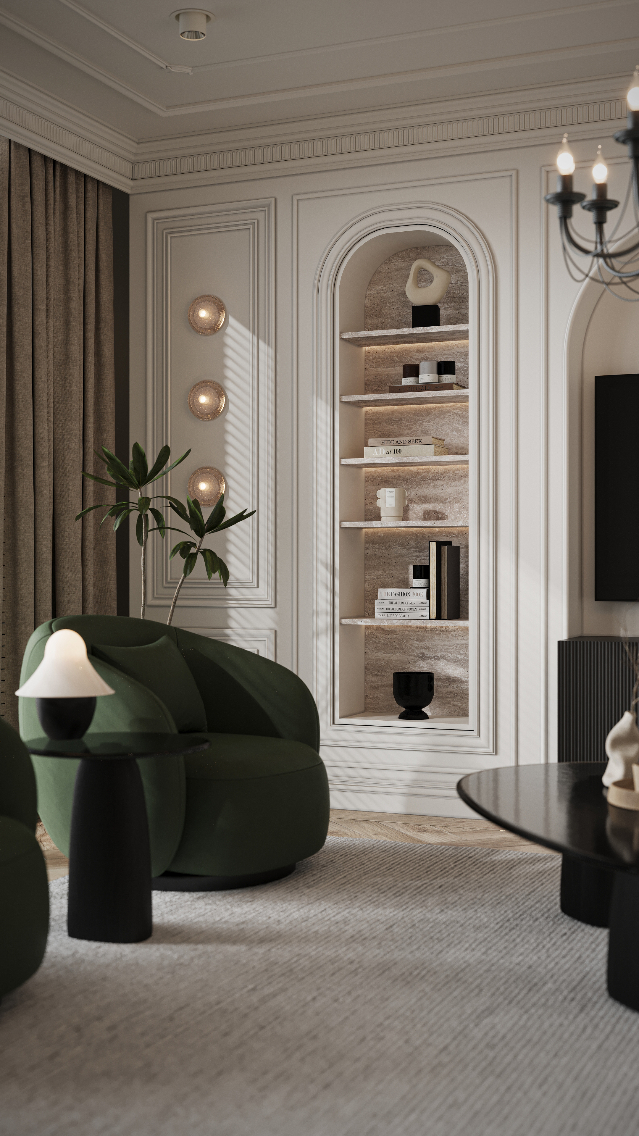 Misstanbul Başakşehir’in ve kentin dokusuyla uyumlu bu tasarım, klasik avrupa estetiğini çağdaş formlarla ve eklektik dokunuşlarla harmanlayan rafine bir yaşam alanı sunuyor. Mekanın ruhunu belirleyen geleneksel duvar çıtalamaları ve Osmanlı mimarisinden esinlenen “Bursa kemerli” niş detayları, organik formlu mobilyalar ve monokromatik bir renk paletiyle dengelenerek zamansız bir atmosfer oluşturuyor. Zeytin yeşili kadife berjerler ve siyah cam orta sehpa gibi güçlü odak noktaları, doğal ahşap parkelerin sıcaklığı ve yumuşak tekstil dokularıyla birleşerek hem lüks hem de davetkar bir bütünlük sağlıyor.